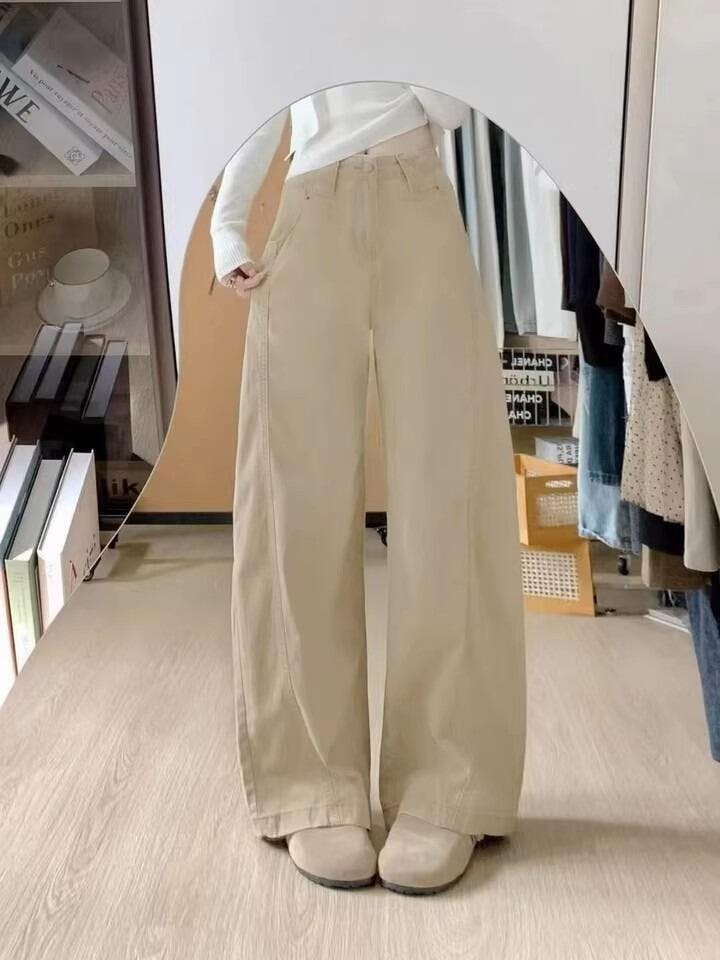 - Design: High-waisted "banana fit" straight-leg cut with structural seam detail