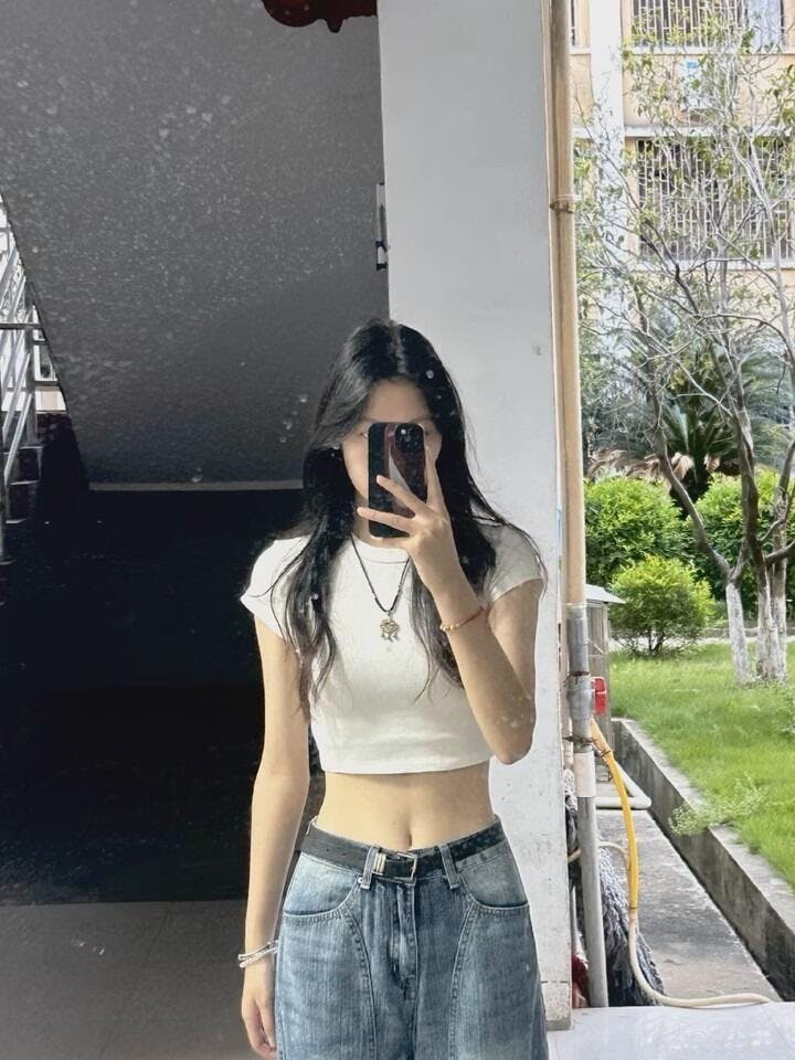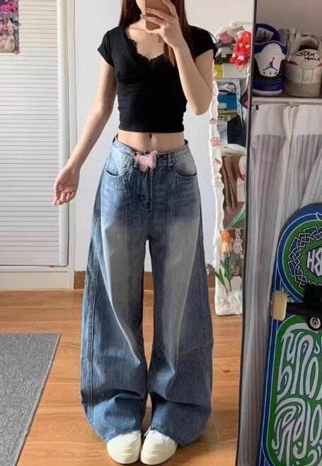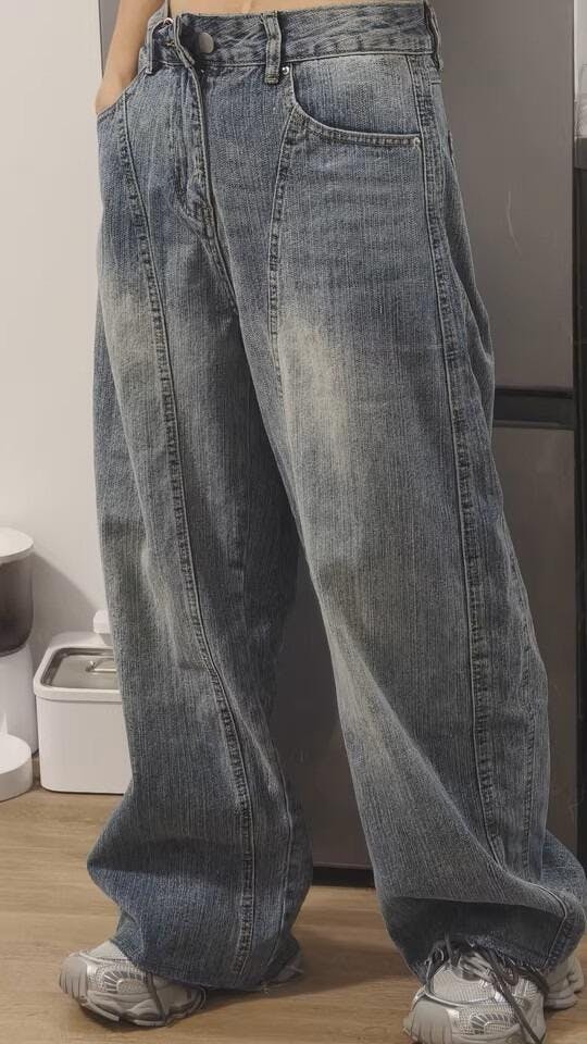 • Design: High-waisted wide-leg silhouette with curved hem, vintage wash