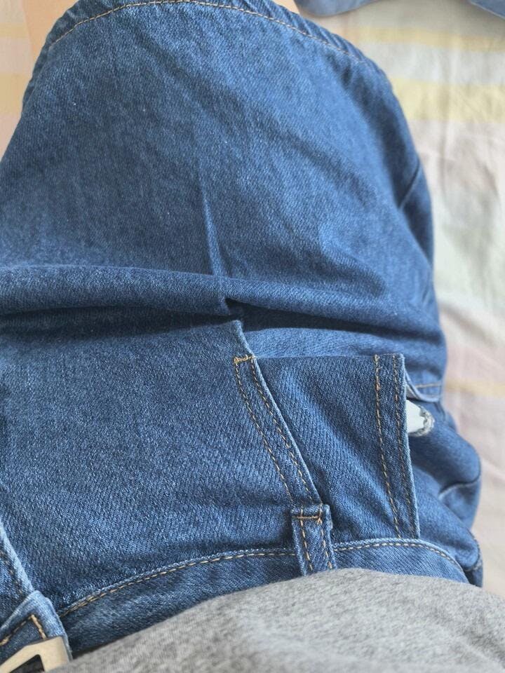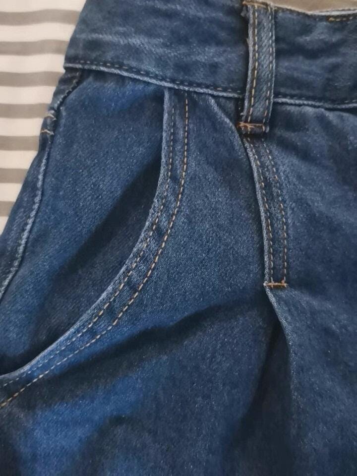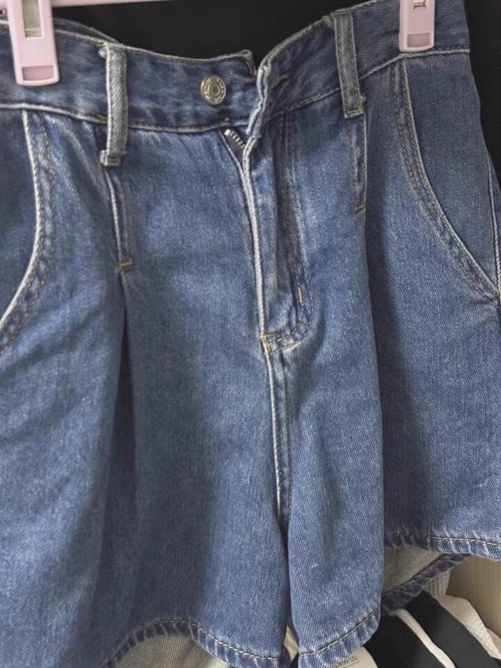 • Design: High-waisted A-line cut with single-button waist buckle, straight and slightly flared leg opening